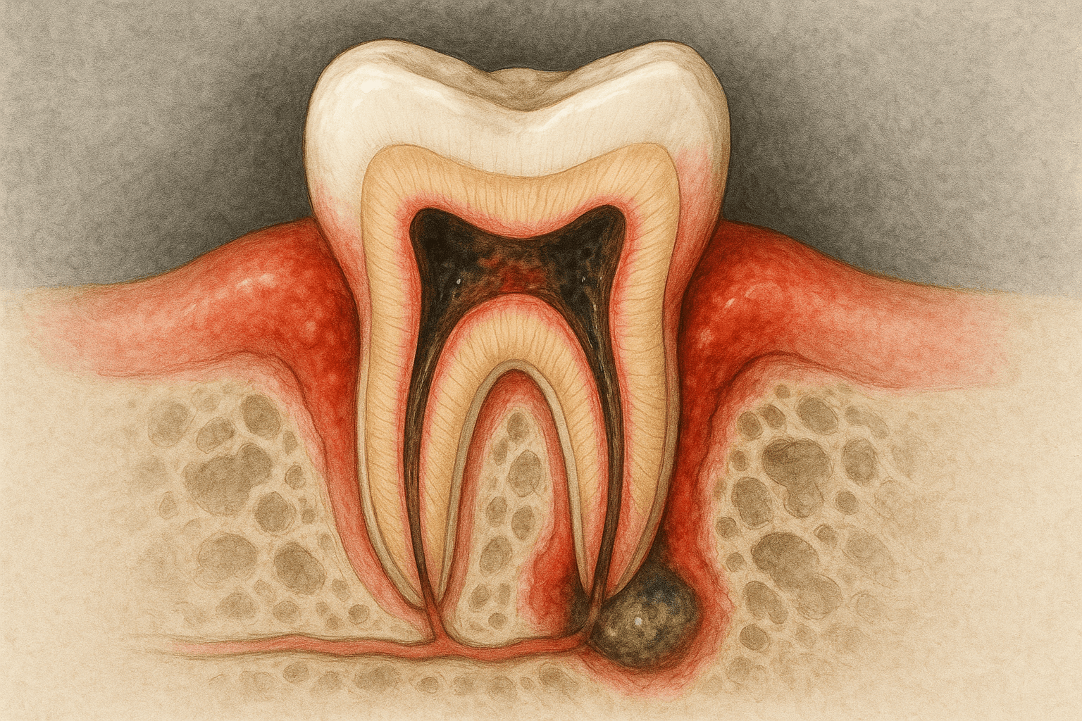 Основной причиной заболевания становится неполеченный кариес, который приводит к инфицированию корневых каналов. К другим причинам относятся травмы зуба, некачественное лечение корневых каналов, а также гингивит и пародонтит, которые создают благоприятные условия для проникновения инфекции.